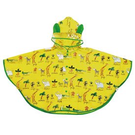 ゾウやサルなどジャングルのかわいい動物達のイラストのレインポンチョです。